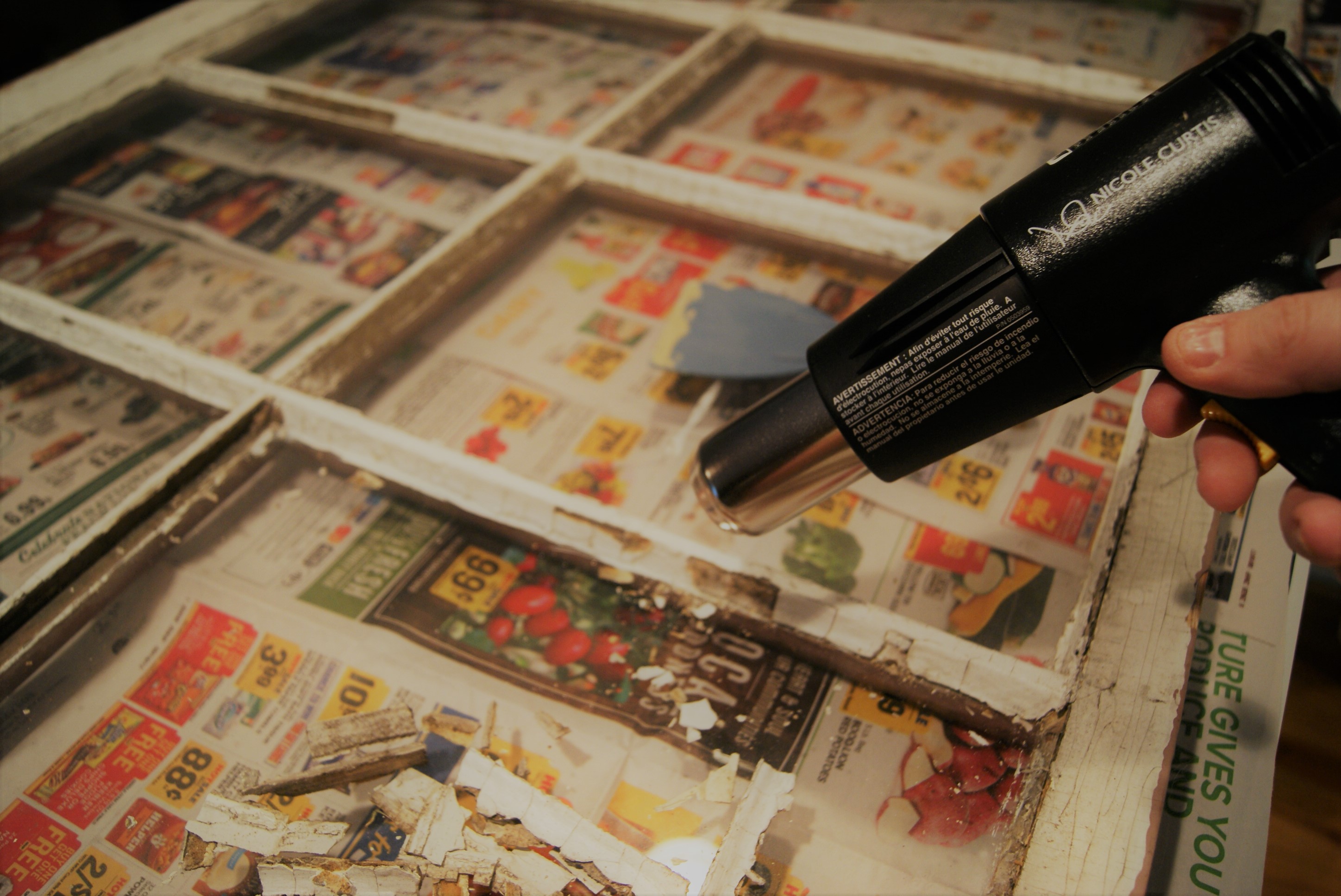 I wanted to use the exterior of the window as the outer portion of my frame. I placed the window on a layer of newspaper and used a plastic putty knife to remove the loose paint from the window. As I wanted to have a bit of a rustic feel to the frame, I didn’t worry about removing all of the paint.