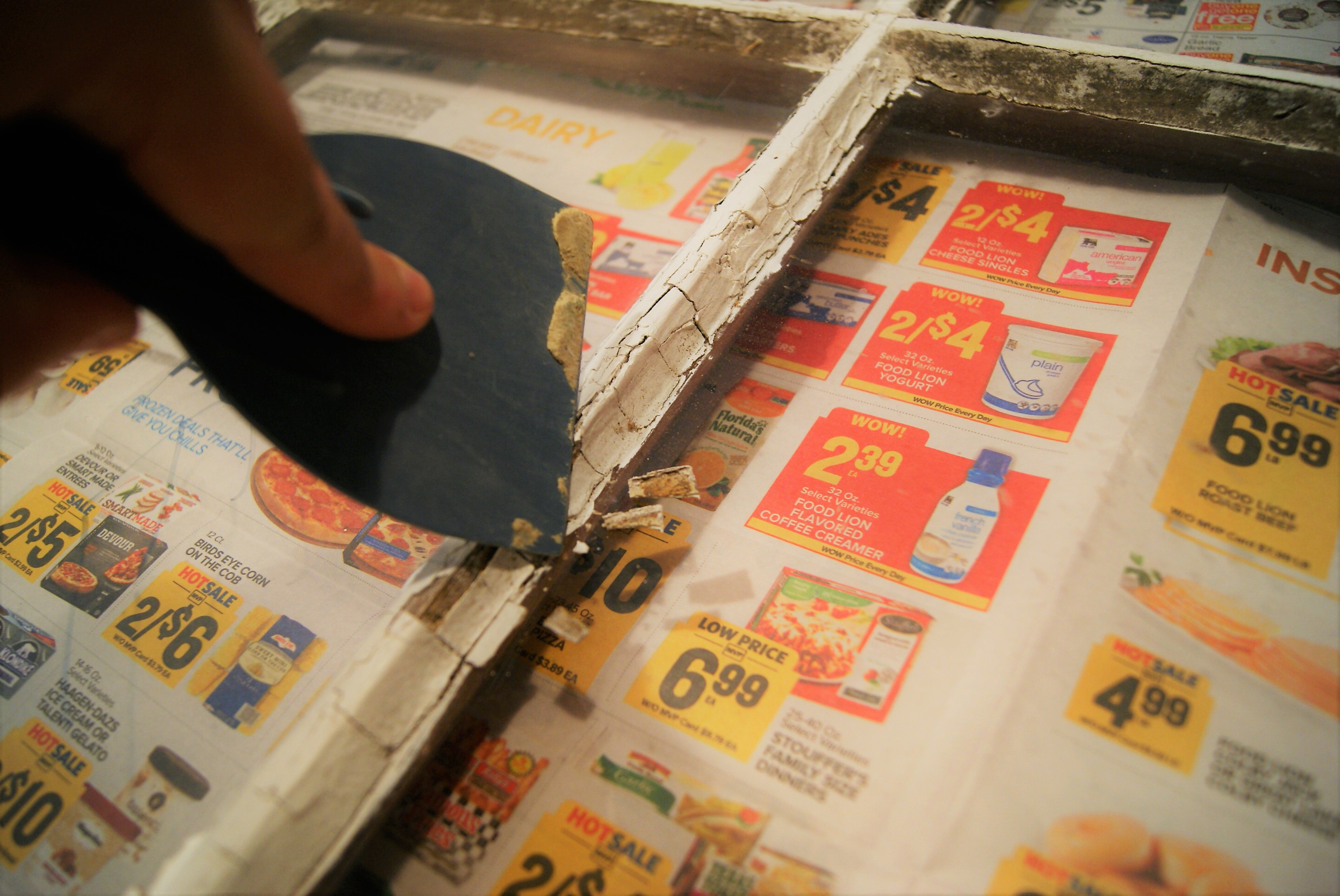 The next step was to remove all of the old, cracked window glaze. A good bit of it was already missing, and most of it popped off pretty easily with me just using my fingers to pry it off.